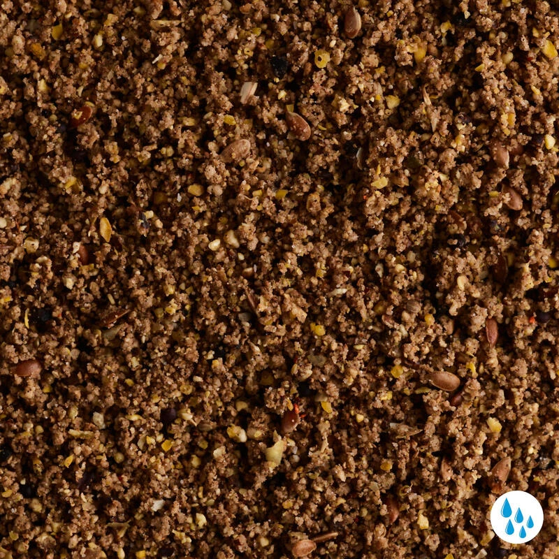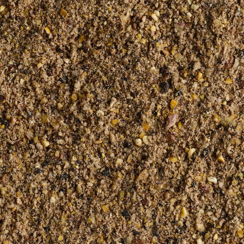Maïs, chapelure, biscuit, tourteaux de coprah, lin applati (10%).