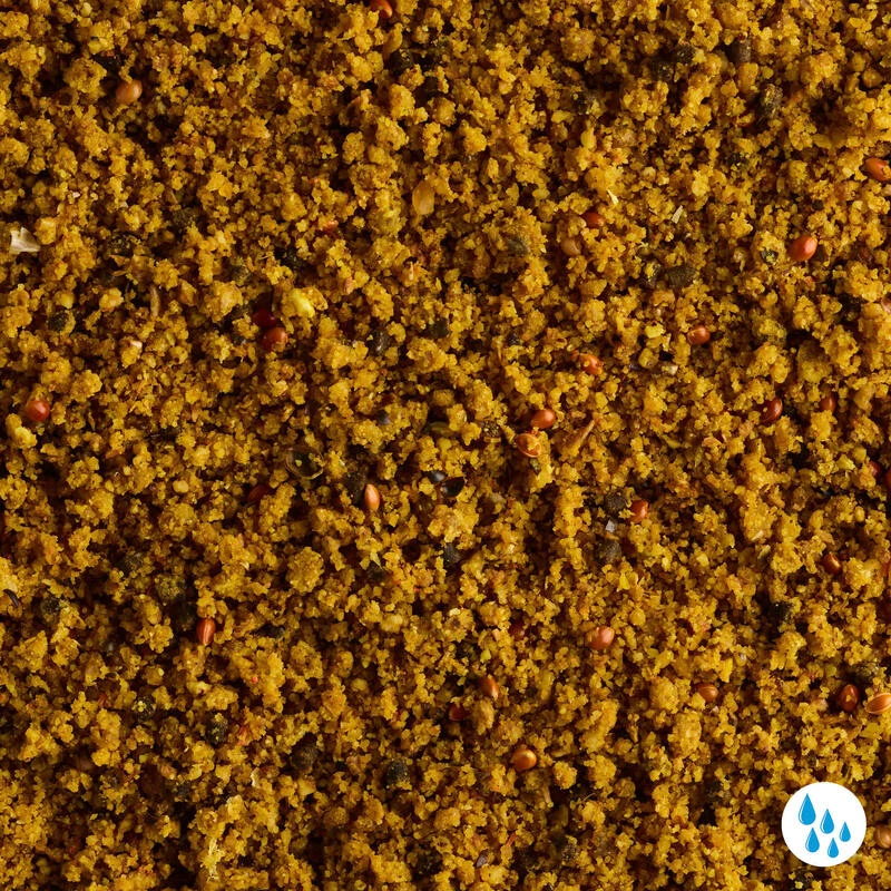 Chapelure, graine de millet roux, pellet (blé, farine de poisson, tourteau de soja, huile de colza, farine de sang, huile de poisson) (7%), maïs, chenevis, noix tigrée, ail (1%), arôme ail (1%)