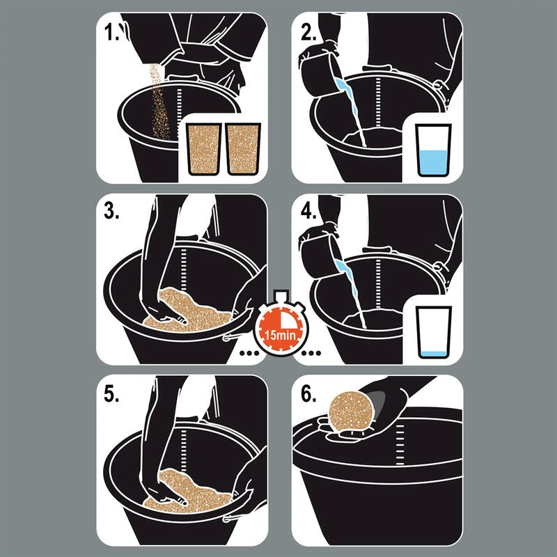 On commence tout d’abord par verser les 3/4 du volume d’eau nécessaire en mélangeant énergétiquement avec la main dans un seau rond pour permettre aux particules de l’amorce de se gorger d’eau.