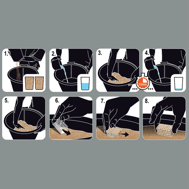 On commence tout d’abord par verser les 3/4 du volume d’eau nécessaire en mélangeant énergétiquement avec la main dans un seau rond pour permettre aux particules de l’amorce de se gorger d’eau.
